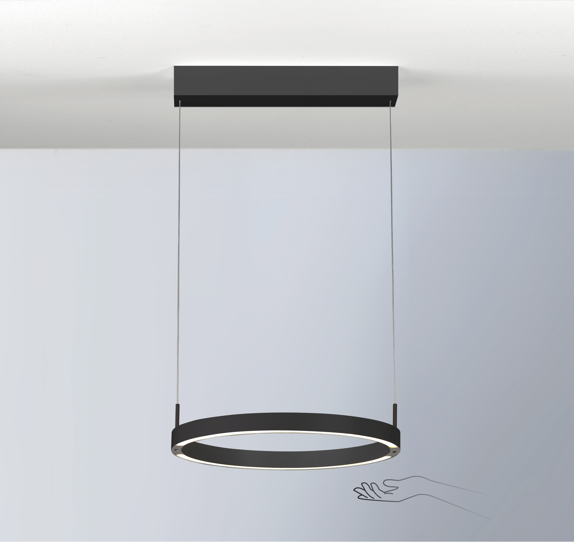 Il lampadario ad anello Float di Bopp colpisce per il suo design minimalista e la sua tecnologia funzionale. La luce superiore e quella inferiore possono essere accese e regolate separatamente tramite comando gestuale, mentre la temperatura di colore può essere contemporaneamente regolata da 5000K a 2000K (Dim-To-Warm).